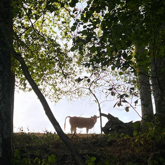 Prompt liep er een koe over een richel in het vizier en draaide, badend in het ochtendlicht als de Aartsengel Gabriël met een boodschap uit de hemel, haar kop naar me toe. Het was een intense blik waarin ik verbinding met mij, met het bos en ja, met alles, teruglas. Ik knikte naar haar en glimlachte om duidelijk te maken dat ik geen kwaad in de zin had, maar gewoon in extase was.